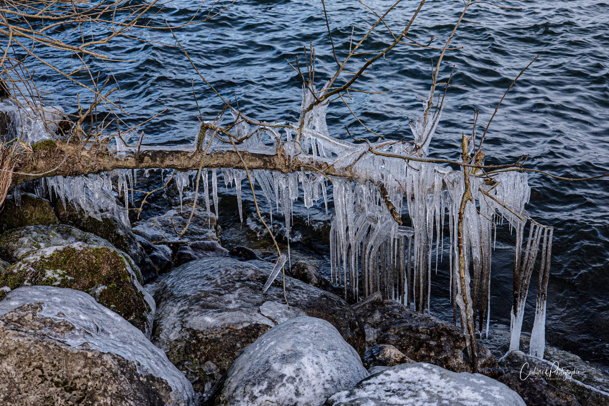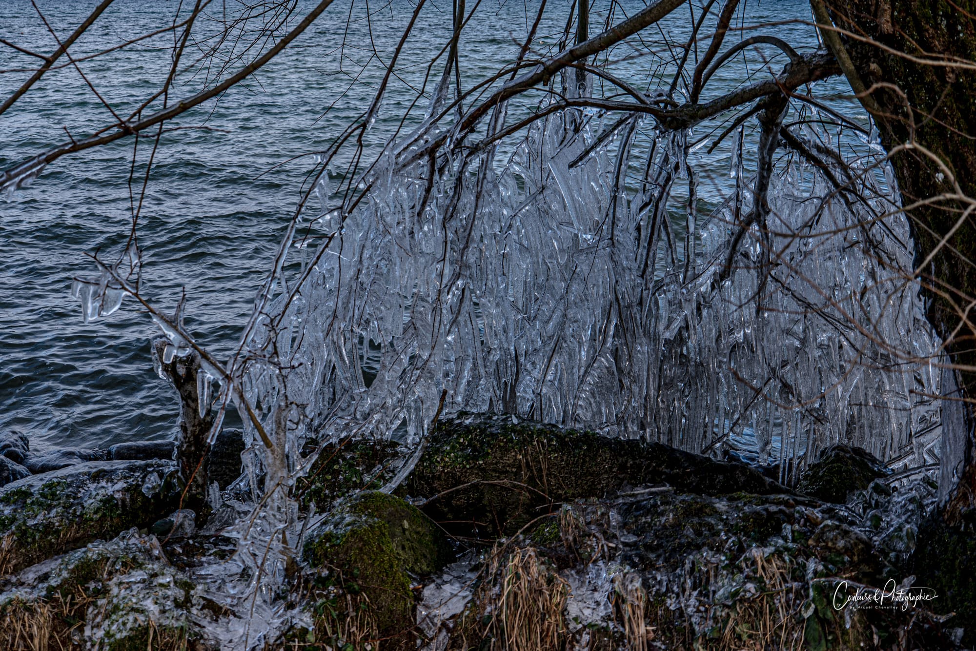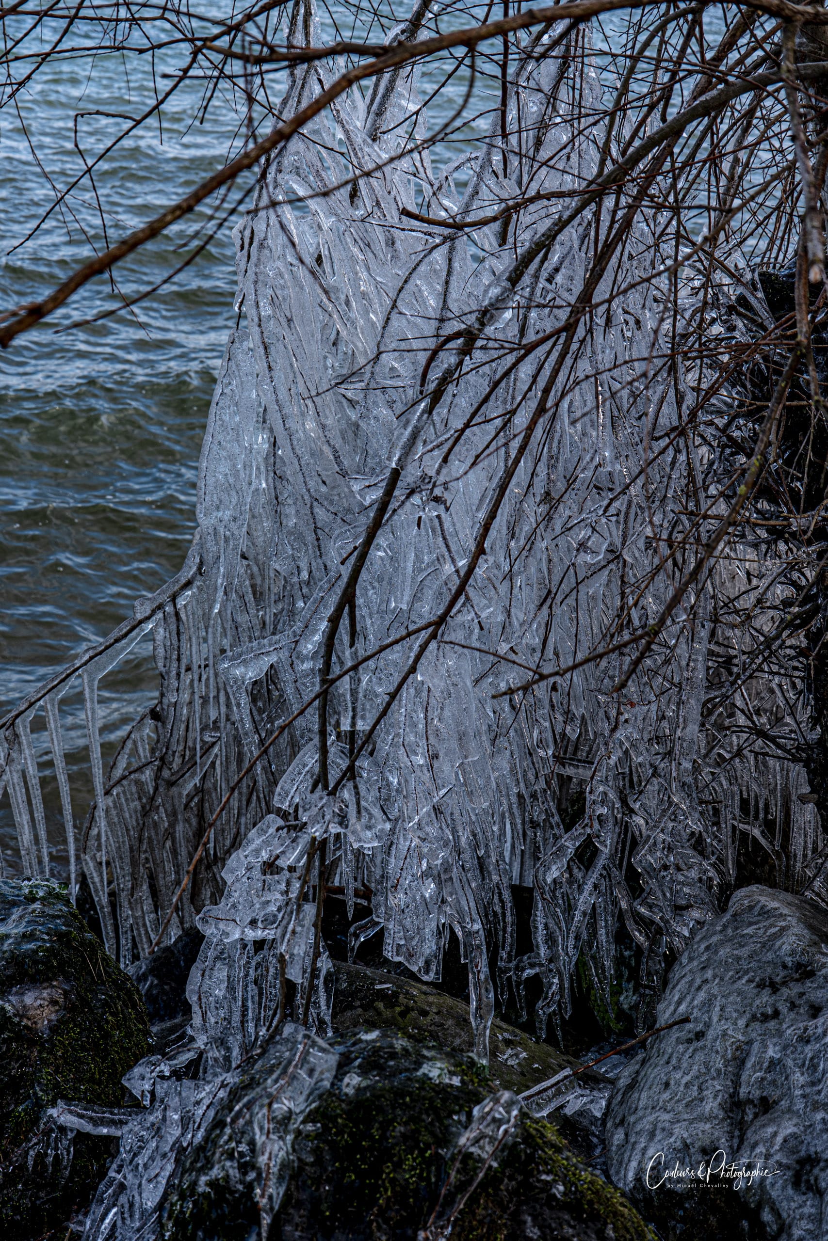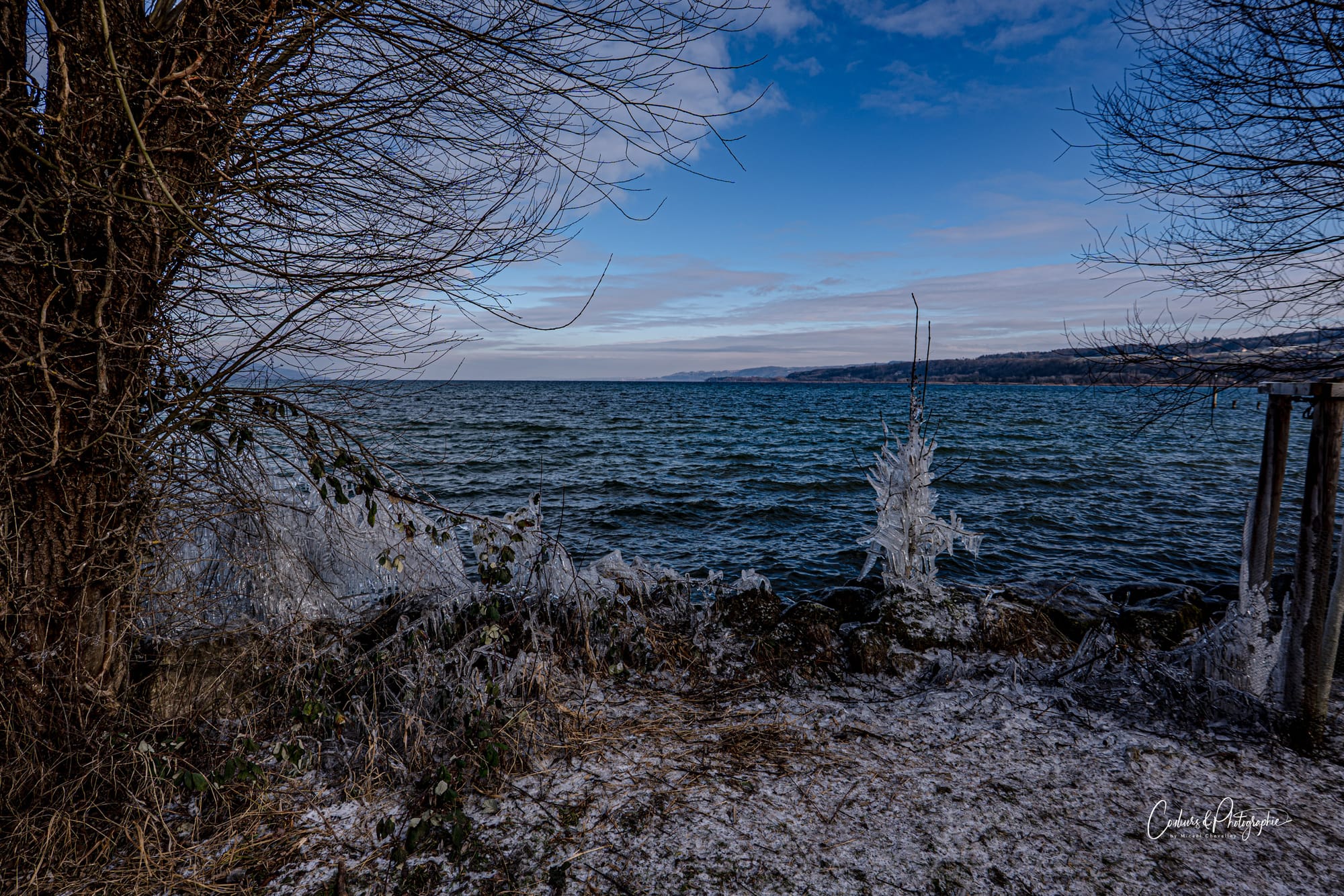 Bien que nous ne soyons pas en période de grand froid et qu'aucun vent tempétueux ne souffle, le lac est suffisamment mouvementé pour commencer, toujours lentement mais sûrement, à sculpter des colonnes de glaces délicates aux abords de la petite plage. C'était la surprise du jour. Ambiance âge de glace ou cristal de Versailles. Des détails étincelants créés par le balancement des flots.